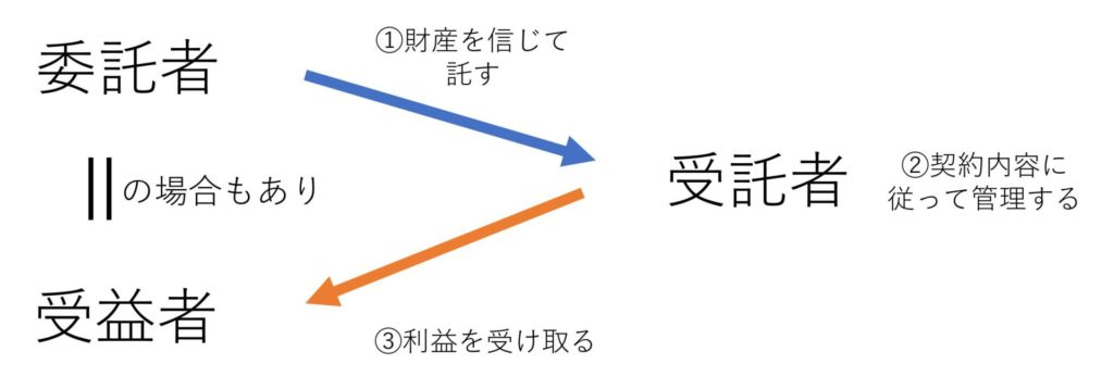 委託者が、受託者との間でその管理・運用方法についての契約を結び、実際に権利移転を受けて財産を預かった受託者が管理・運用をし、それにより生じた利益を受益者が取得する、という仕組みです。委託者と受益者が同一人であることもよくあります。